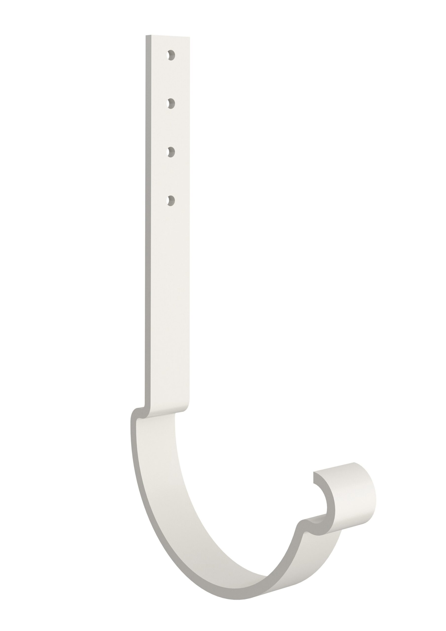 This hanger is designed for on the roof installation. If you lack a fascia board, or have a steep roof pitch, a roof mounted hanger is recommended. Most of our hangers are made of the same material. With steel being 1" thick and 1/5" wide, these hangers are super strong. You need to use a hanger bender to bend the shaft to the correct angle. It is a quick installation where you place the back edge of the gutter into the hanger, and simply push the bead in and down into place.